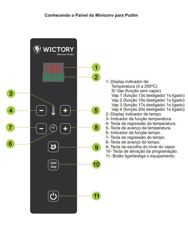 O Forno para Pudim WCPP-535 da Wictory foi desenvolvido especialmente para o preparo de pudins, sem que haja a necessidade de imergir os alimentos em água para o processo de cocção. Por possuir termopar, possibilita um controle preciso da temperatura na câmara de cocção que, em conjunto ao calor homogêneo, torna-se um equipamento excelente para confeitarias de produtos delicados. Equipamento especial, desenvolvido para trabalhar com programação de nível de umidade na câmara do equipamento de modo automático. Diferente dos fornos miniconv tradicionais, que possuem a função vapor manual, este modelo possui uma placa especial com 4 níveis de intensidades diferentes de umidade na câmara de maneira automática. Ideal para quem trabalha com a produção de pudins, pois além da consistência, dispensa o processo de banho maria. Além do tradicional pudim, você pode preparar assados como bolos, biscoitos, tortas e entre outros itens efetuando a programação de tempo e de temperatura para o forno trabalhar somente com o ar quente seco em movimento na câmara.
