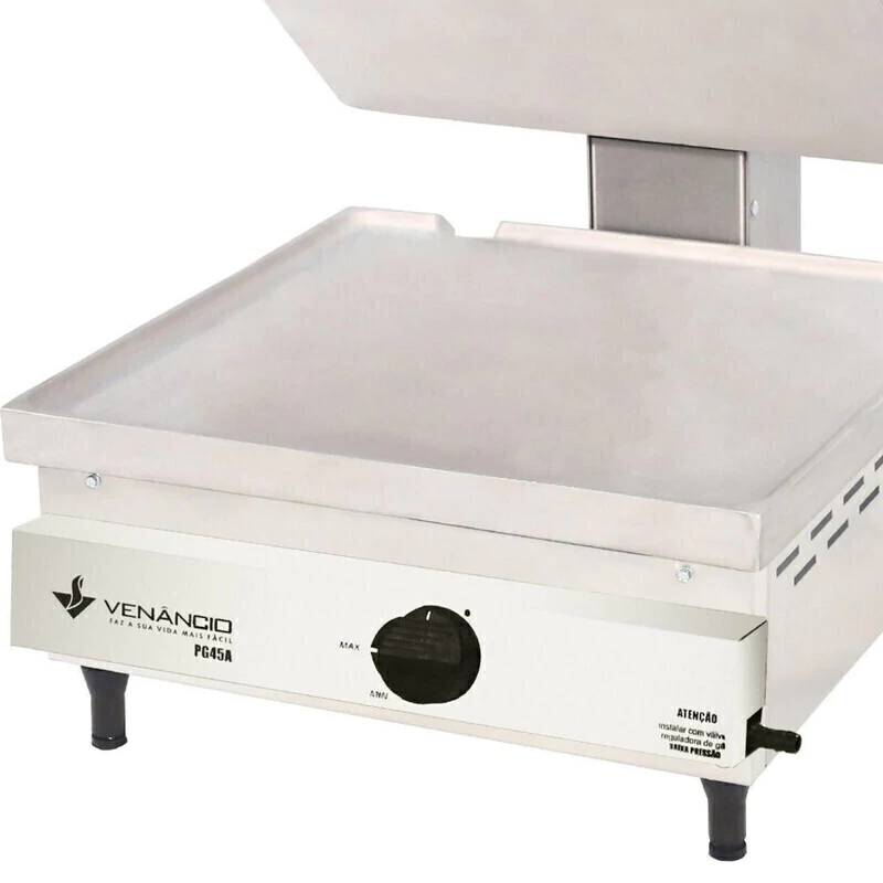 A Sanduicheira Luxo a Gás Venâncio é fabricado em chapa de alumínio fundido, possuindo aquecimento na parte inferior realizado através de queimadores com sistema de gaveta. Possui corpo e painel em aço inoxidável 430, punho da prensa em material resistente ao calor e coletor de resíduos em aço inox 430.