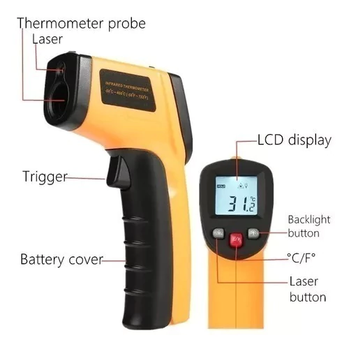 O termômetro infravermelho laser é ideal para medições à distância, além de ser muito fácil de usar, basta apertar o botão para medição.